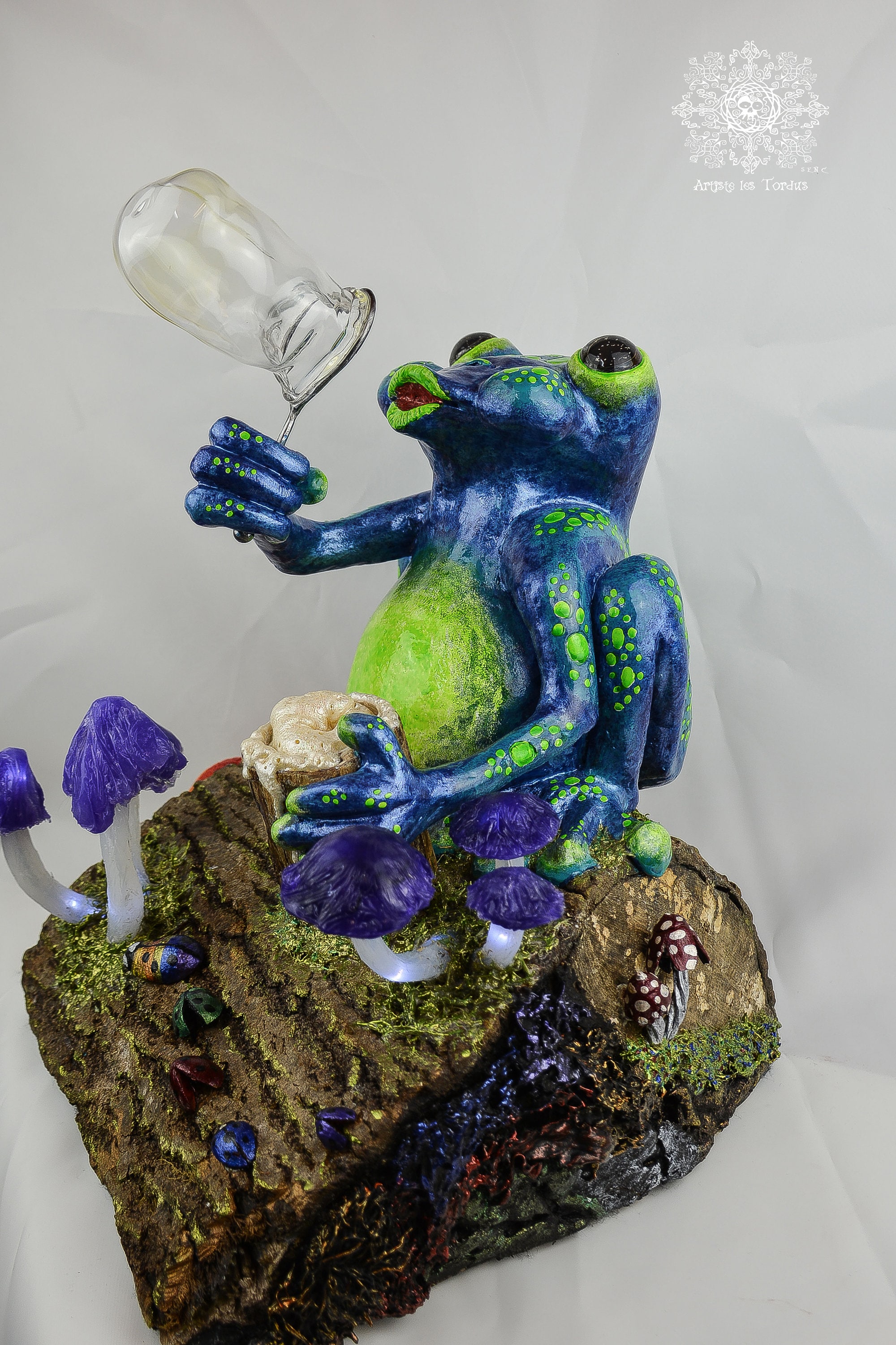 The materials composing this sculpture are recycled, sculpted and assembled metals, as well as resin. The glass bubble is blown by hand by an artist friend who has been painting and sculpting glass for many years, Malem from www.malemglassart.com. Malem is a professional Canadian artist, loving horses and sharing her life with them. This love is reflected in his sculptures and paintings of glass horses, expressing freedom, life, emotions and movement. Besides horses, his glass art is also strongly inspired by nature, animals and sometimes a touch of imagination! The frog was sculpted in clay, then we molded it and then cast it in resin. Everything has been painted to facilitate cleaning and increase its protection.